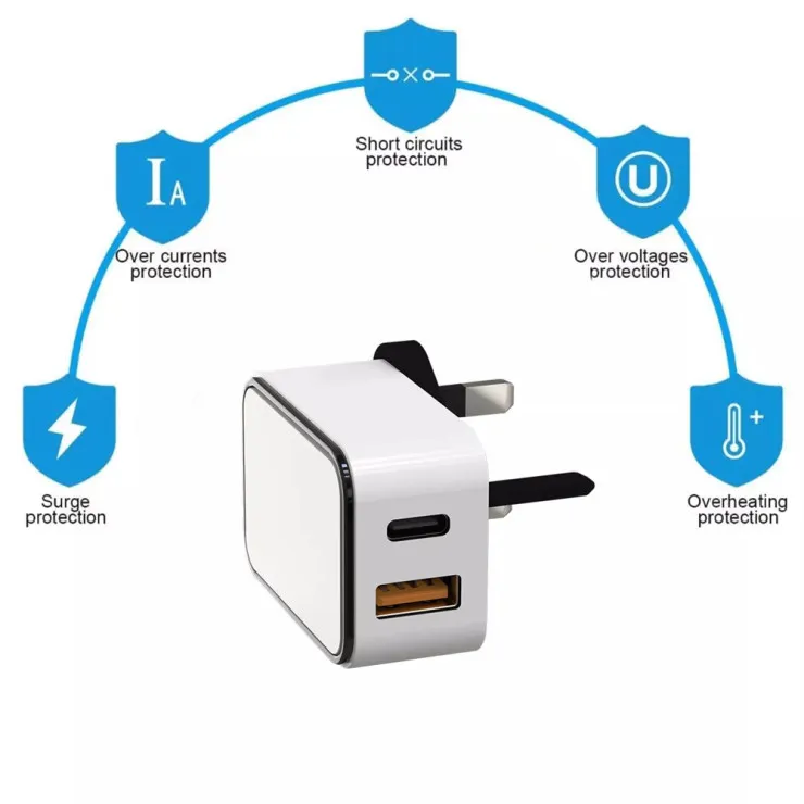 Experience ultra-fast charging with the 18W PD Fast Charger, featuring both USB-C and USB-A