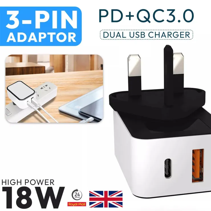 18W PD Fast Charger USB-C & USB-A QC 3.0 for Samsung, iPhone