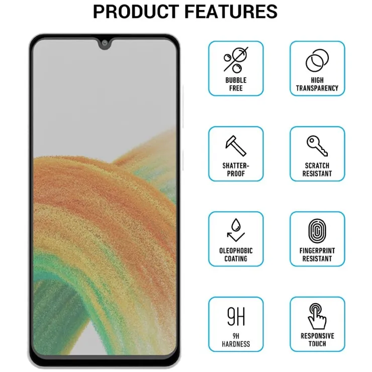 | Compatible Brand | For Samsung Galaxy | Compatible Model | Samsung Galaxy A33 5G | Type | Screen Protector | Features | Anti-Scratch, Anti-Shatter, Full Coverage, Tempered Glass, Oleophobic Coating, Rounded Edges & Slim Glass, Surface Hardness 9H, Ultimate Touch Sensitivity & Whole Privacy | Material | Tempered Glass | Color | Black | Manufacturer Warranty | 30 Days | Package Include | 2X Screen Protector |
