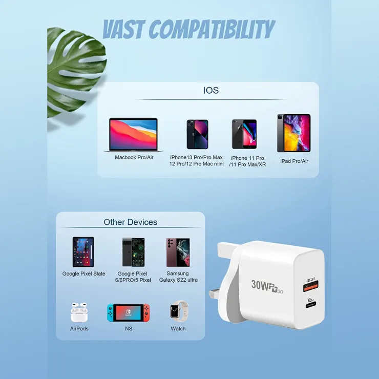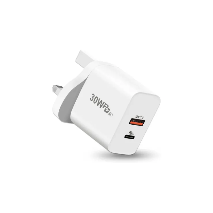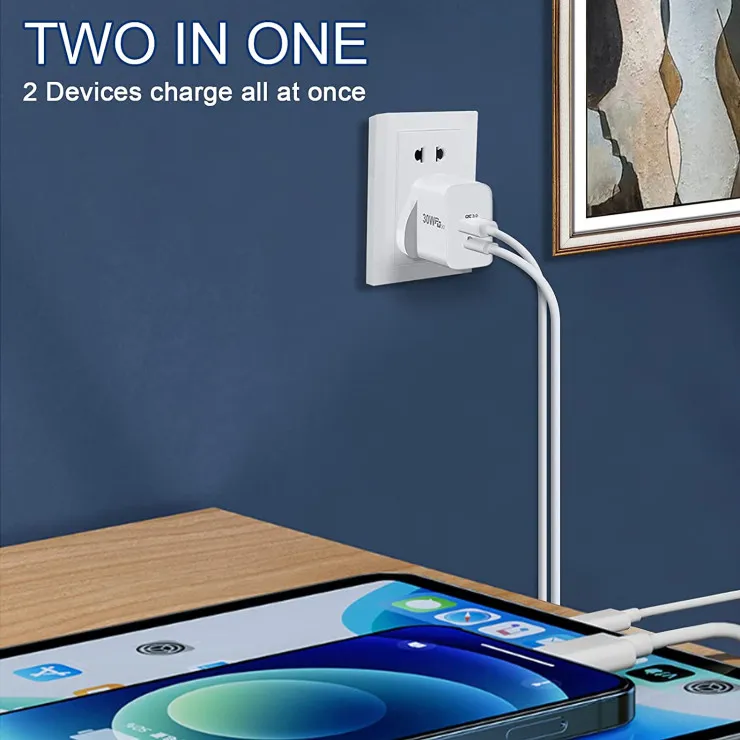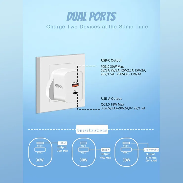 Two mobile devices can be charged simultaneously with a 30 Watt wall charger.