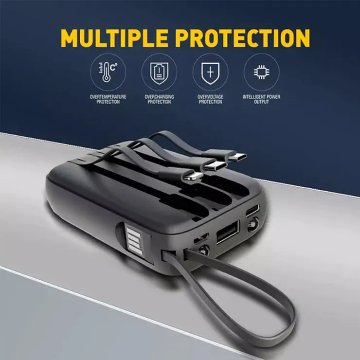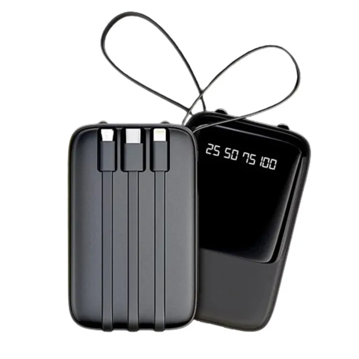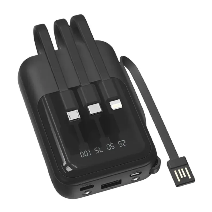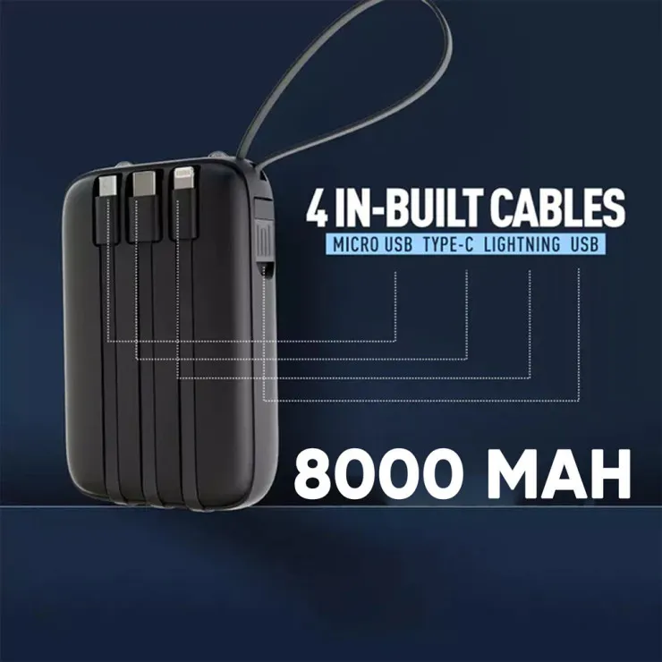 | Features | USB/Micro USB/Type C/for Apple Cable, LED Flashlight, 4 cables, LED display, Built in Cables, Digital display, Charger & Battery in 1, 8000mah Battery | Connectivity | Micro-USB, USB-C, 8 Pin | Design/Finish | Plain | Material | ABS Plastic | Compatible Model | Universal | Colour | Black | Package Includes | 1x Power Bank | Type | Power Bank 8000mAh |