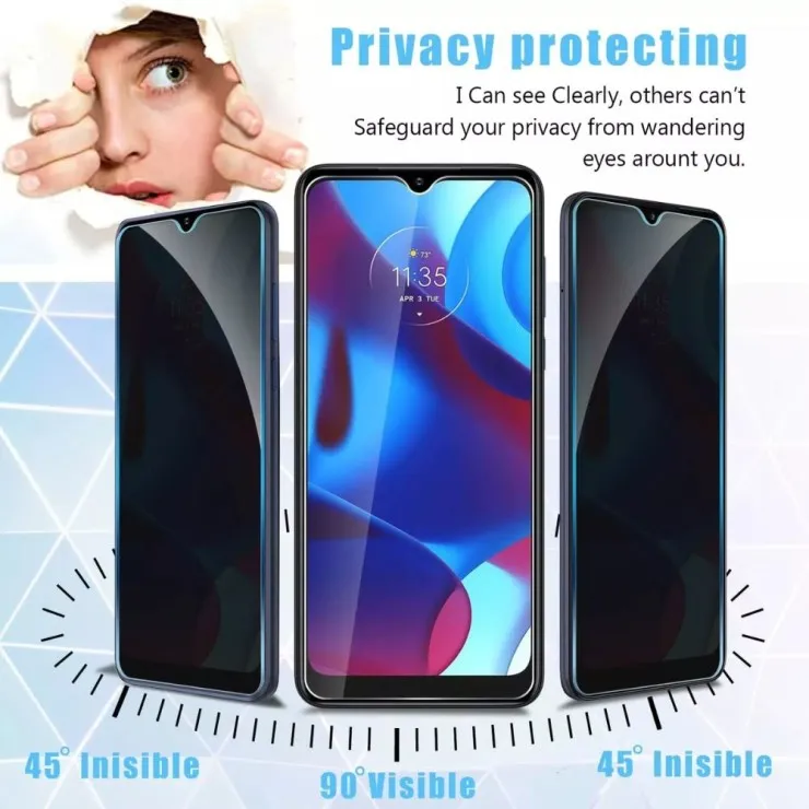 Safeguard your sensitive data and screen activity with cutting-edge anti-spy technology. This privacy screen protector for the TCL 10 SE is designed to block side views, making the display visible only to the person directly in front of the screen. Whether you're checking emails, browsing social media, or watching videos on the go, this protector helps keep your information private. It's ideal for professionals, students, or anyone who uses their phone in public areas such as trains, buses, cafés, or offices. The privacy layer significantly reduces glare while maintaining screen clarity for the user.