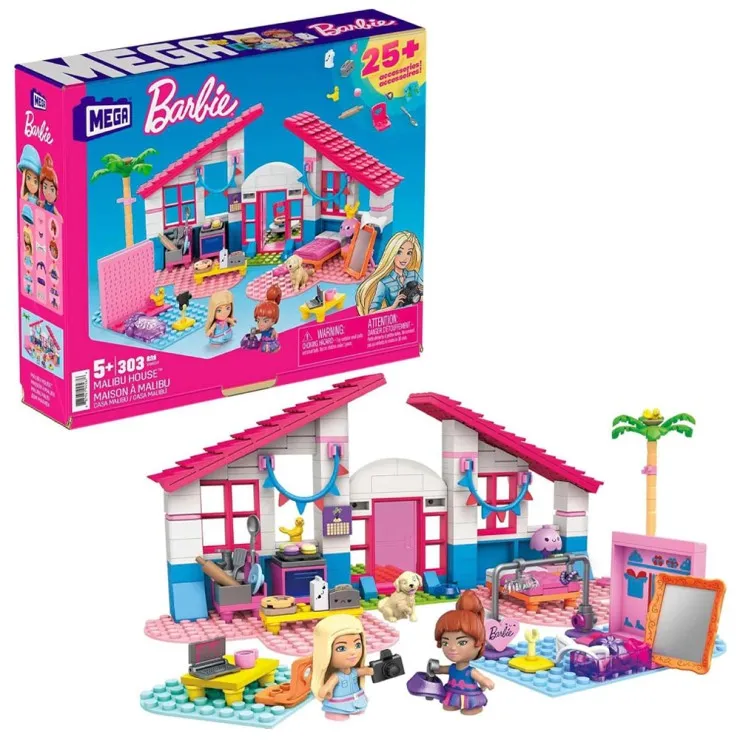 | Brand | Mega Bloks | Type | Building Block Toy | Features | Mega Bloks Barbie Malibu House (303 pcs) with 2 dolls, 3 pets, 293 bricks, 5 baseplates & 9 accessories; build, play, and decorate, ages 5+. | Material | Plastic | Color | Multicolor | Number of pieces | 303 | Theme | House | Manufacturer recommended age | 5 years And up |