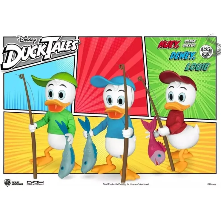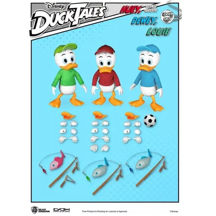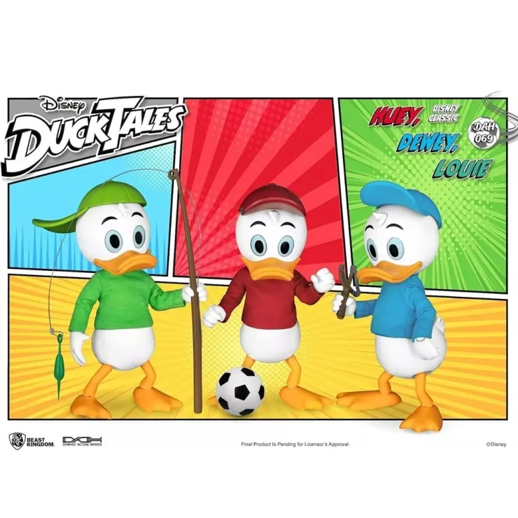 | Brand | Beast Kingdom | Franchise | Disney | Type | Action Figure | Character | Dewey, Huey, Louie | Features | Classic DuckTales design, 10 cm tall figures, real fabric clothing, 12+ articulation points, interchangeable mouths and hands, fishing rods, fish, football, and slingshot accessories. | Material | Polyvinyl Chloride | Color | Multi Colors | Model Number | DAH-069 | Product Dimensions | 5.08 x 10.16 x 5.08 cm; 816.47 g | Manufacturer recommended age | 15 years and up | Package Include | 1X Beast Kingdom DuckTales Huey, Dewey & Louie Action Figures |