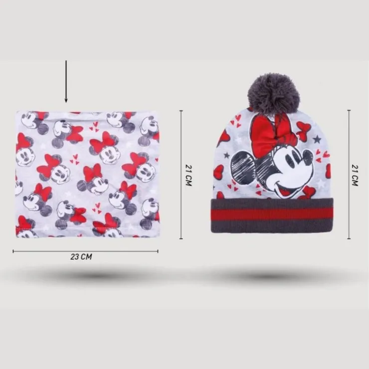 This attractive Minnie Mouse hat and gloves set is made for both girls and adults. The Minnie beanie or Minnie bobble hat pairs seamlessly with a soft fleece snood (neck warmer) and knit gloves. Designed with iconic Minnie details, this winter set is ideal for those looking for a stylish matching scarf and gloves combination.