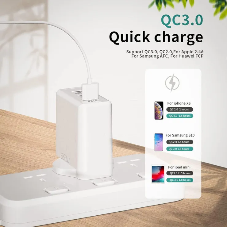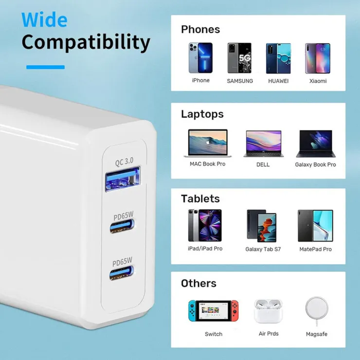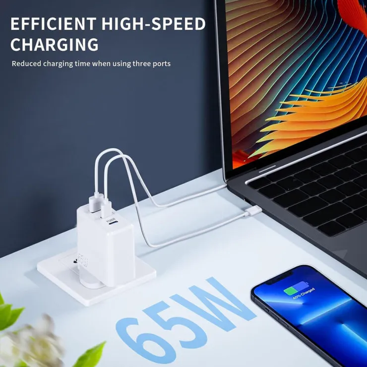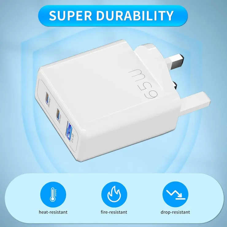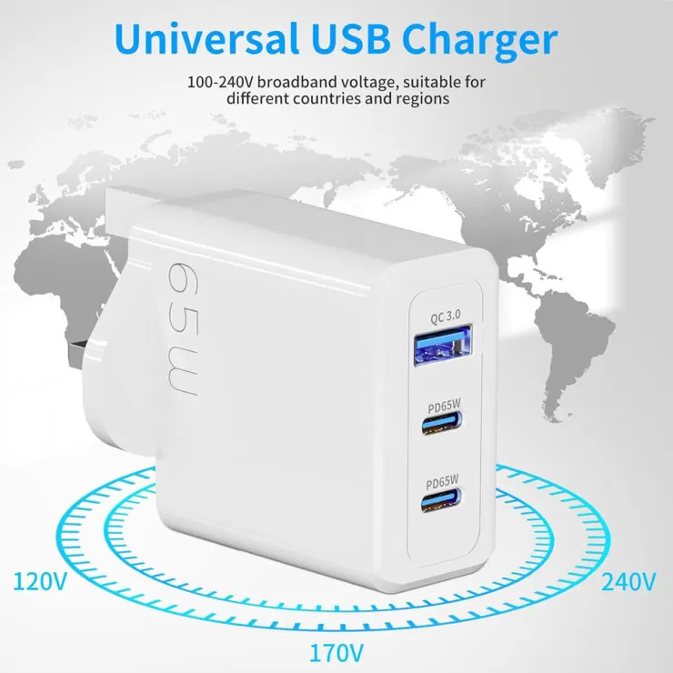 | Compatible Models | Universal | Compatible Brand | Universal, For Apple, For Huawei, For Samsung | Features | Anti-Fingerprint, Fast Charge, Heavy Duty, Shockproof, Over Voltage Protection, Battery Protection | Type | Charger Plug | Mounting Type | 3-Pin Mains | Number of Ports | 3 | Connectivity | Dual Type-C, USB | Mounting Location | Wall | Material | ABS Plastic | Package Includes | 1X 65W Charger Adapter |