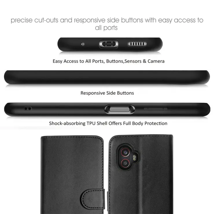 Elevate your Galaxy XCover6 Pro with this Black Flip Leather Wallet Case, designed to combine timeless elegance with practical functionality. The premium leather exudes sophistication, while the flip cover provides all-around protection. Inside, multiple card slots keep your essentials organized, making it perfect for those on the go.