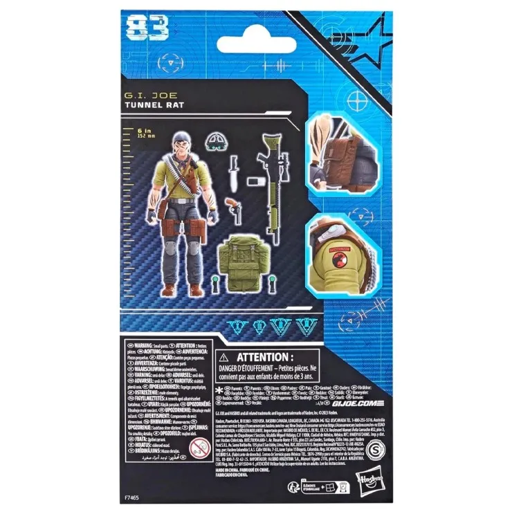 | Brand | Hasbro | Franchise | G.I. Joe | Type | Action Figure | Features | 6-inch figure, premium detailing, 9 accessories, poseable joints, collectible box, model F7465 | Material | Plastic | Color | Multi Colors | Item model number | F7465 | Manufacturer recommended age | 4 years and up | Product Dimensions | 5.1 x 14 x 25.4 cm; 150.25 g | Package Include | 1X G.I. Joe Classified Series Tunnel Rat Figure |
