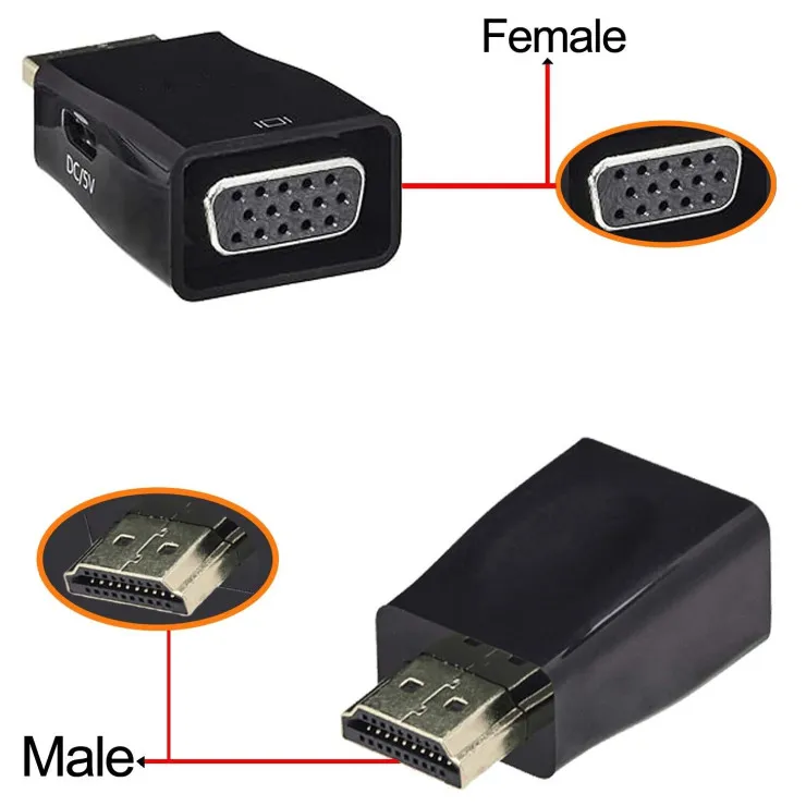 | Compatible Model | Universal | Colour | Black | Package Includes | 1x | Features | Portable, Quickly and Easily, Male to Female, 1920x1080 (1080p Full HD), Easily connect to projectors, TVs, monitors, and other, Compatible With All HDMI to VGA Port, HD monitors or displays, ?compact, OTG, Quick, Convenient Access. | Type | VGA Female to HDMI Male Adapter | Output Voltage | 5 V | Connector A | HDMI Micro Male |