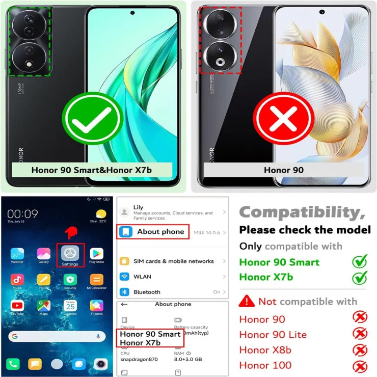 | Compatible Brand | For Honor | Compatible Model | For Honor 90 Smart | Type | Honor 90 Smart | Features | Anti-Drop, Kickstand, Magnetic, Flip wallet cover, Card Slot, Screen Protection, | Material | High Quality Leather, Silicone | Color | Black, Blue and Rose Gold | Manufacturer Warranty | 60 Days | Package Include | 1 x Honor 90 Smart Honor 90 Smart |