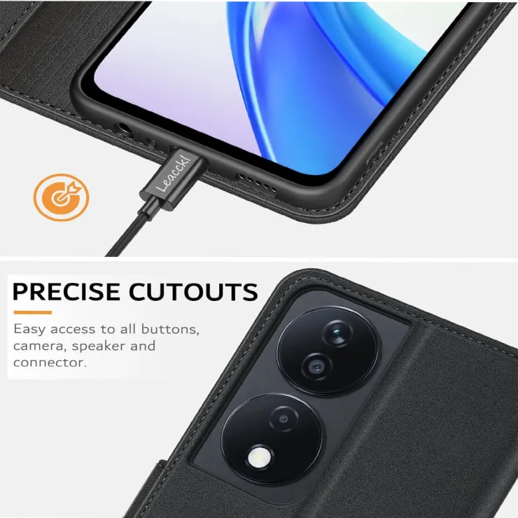 This elegant leather wallet cover is precisely crafted for the Honor 90 Smart, ensuring a secure and tailored fit. Every cutout is engineered for seamless access to all ports, buttons, cameras, and speakers, allowing you to use your phone effortlessly without removing the case.