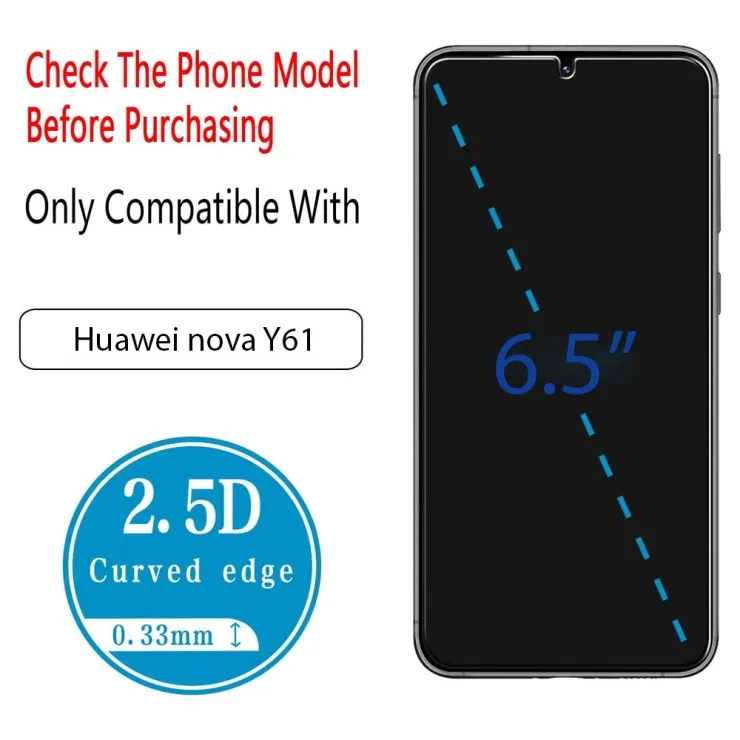| Compatible Brand | For Huawei | Compatible Model | Huawei nova Y61 | Type | Screen Protector | Features | Anti-Scratch, Anti-Shatter, Full Coverage, Tempered Glass, Oleophobic Coating, Rounded Edges, Slim Glass, Surface Hardness: 9H, Ultimate Touch Sensitivity, Whole Transparency | Material | Tempered Glass | Color | Ultra Clear | Manufacturer Warranty | 30 Days | Package Include | 2xScreen Protector |