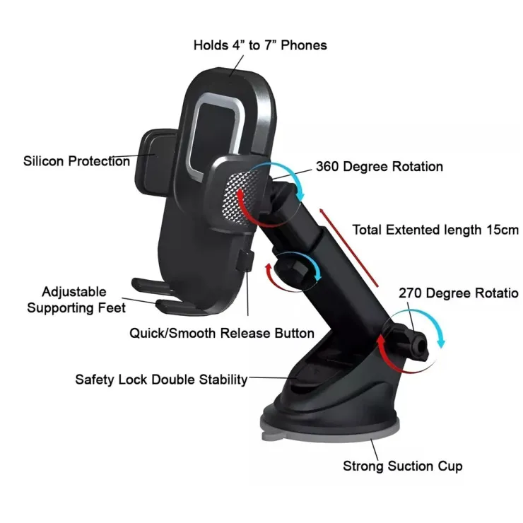 | Compatible Brand | Universal | Compatible Models | Universal | Features | 360 Degree Rotation, Driving Single Hand Adjustment angle of view, Easy to use, 100% Safety of the Device While Driving, Useful for both Windshield Windscreen and Smooth Dashboard, Expandable upto 90mm Width, Suitable for CAR, TRUCK, LORRY CARAVAN, Strong Adhesive Silica Gel at the bottom for Strong Suction, Fit for all Samsung Phones | Type | Phone Holder | Mounting Location | Dashboard, Windshield, Windscreen | Mounting Type | Sticky Pad, Suction Cup | Material | ABS+PC | Color | Black | Manufacturer Warranty | 60 Days | Package Includes | 1 x 360° Universal In-Car Phone Holder Mount |