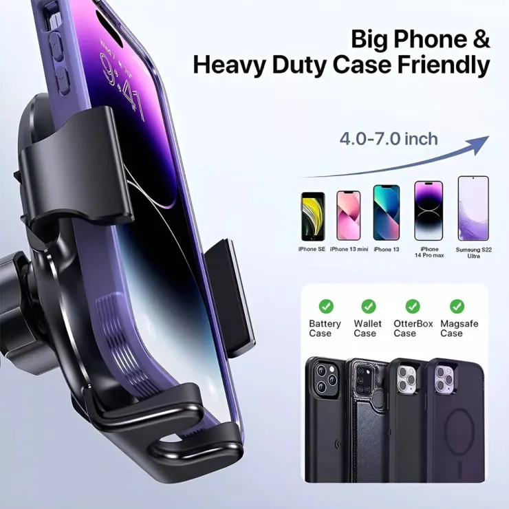 Designed to accommodate a wide range of smartphones, this versatile in-car dashboard phone holder is compatible with popular devices such as iPhone, Samsung Galaxy, Google Pixel, Huawei, and other similar-sized smartphones. Its adjustable clamp arms securely grip your device, preventing slips and falls, ensuring safe and convenient access while driving.