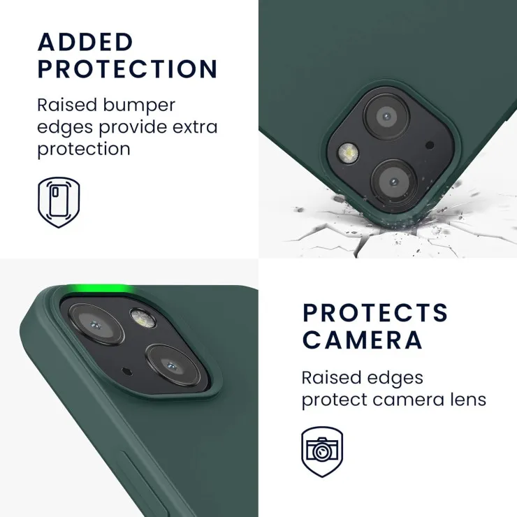 Upgrade your iPhone 13 with this shockproof dark green liquid silicone case — a blend of style, comfort, and reliable protection.