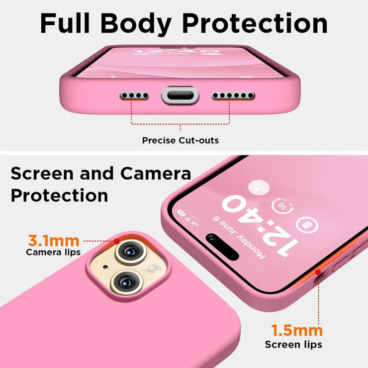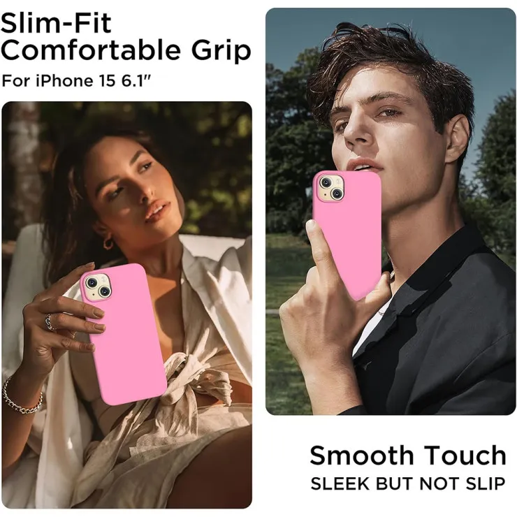 Add a splash of sophistication to your iPhone 15 with this pink silicone case crafted from soft, premium TPU material. The silky-smooth texture feels comfortable in your hand while offering a chic and feminine aesthetic that’s perfect for everyday use. Its gentle grip ensures your phone stays securely in hand without slipping.