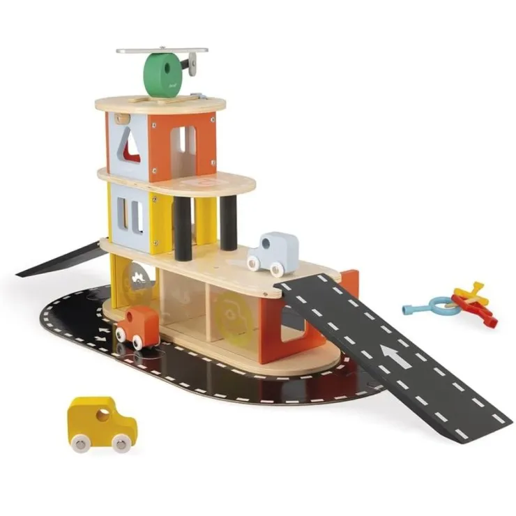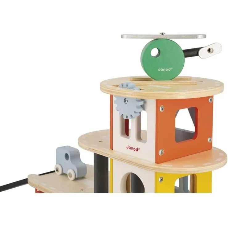 Official Janod Bolid Solid Wood Garage – FSC Wooden Toy Garage with Cars & Helicopter UK J04636