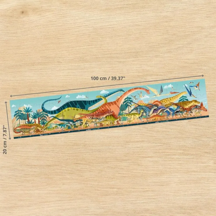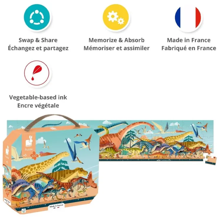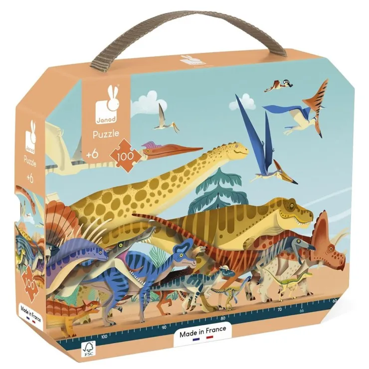| Brand | Janod | Type | Dinosaur jigsaw puzzle. | Features | 100-piece 1-metre panoramic dinosaur puzzle by Janod, eco-friendly FSC cardboard with poster, suitcase storage, and educational Triassic–Cretaceous timeline for kids 6+. | Material | Cardboard | Puzzle type | Assembly & Disassembly | Number of pieces | 100 | Theme | Animals | Manufacturer recommended age | 6 - 10 years | Package Include | 100-piece puzzle, poster, storage suitcase. |