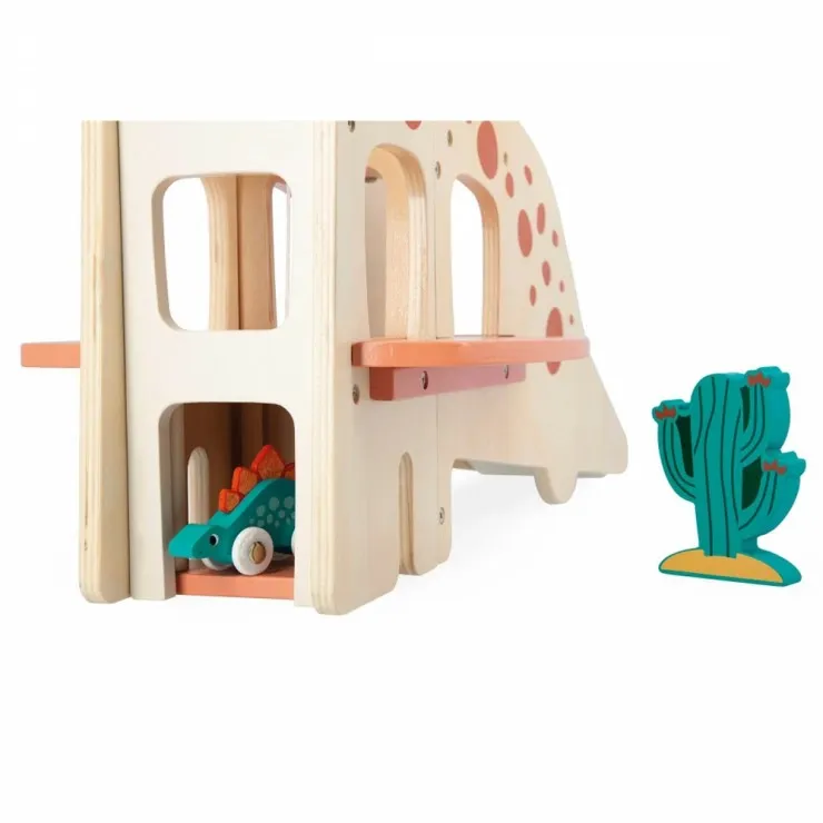 Wooden Dinosaur Garage Playset | Janod Diplodocus Dino Garage with Rolling Dinosaurs & Accessories | 2+ Years