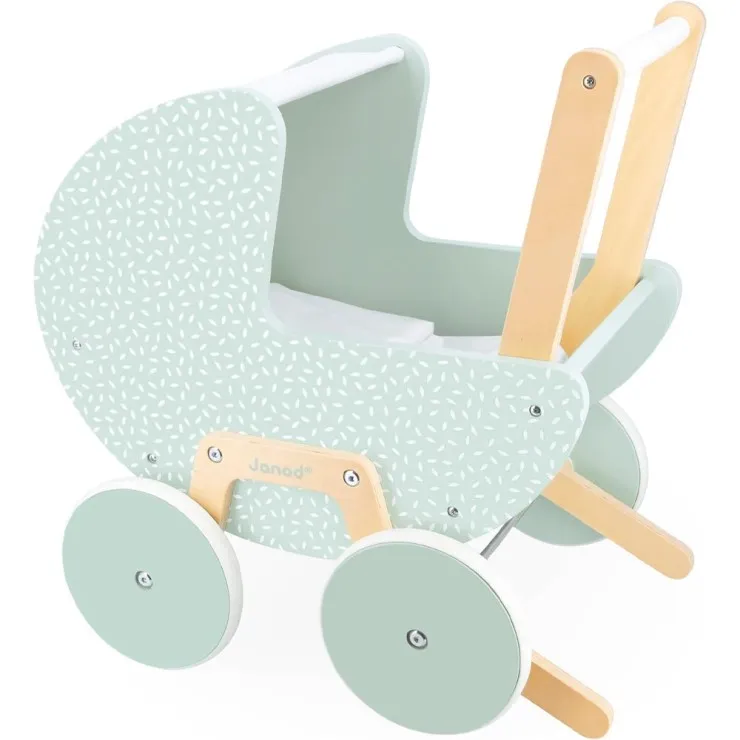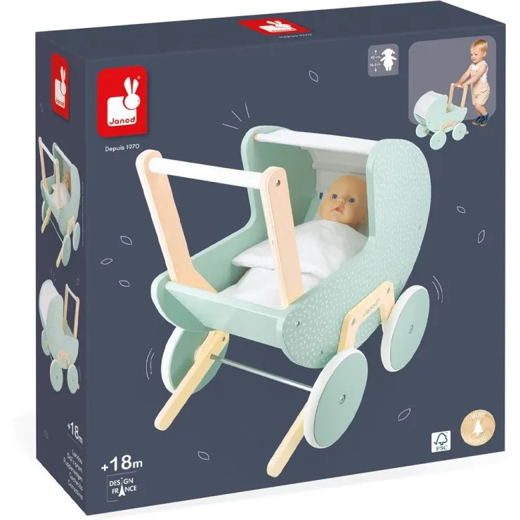 | Brand | Janod | Type | Wooden Toy | Features | FSC wood doll pram with fabric canopy, blanket, pillow, anti-tip system, silent wheels, 44x32x47 cm, ages 18 months+ | Material | FSC Wood | Item model number | J05900 | Manufacturer recommended age | 18 months and up |