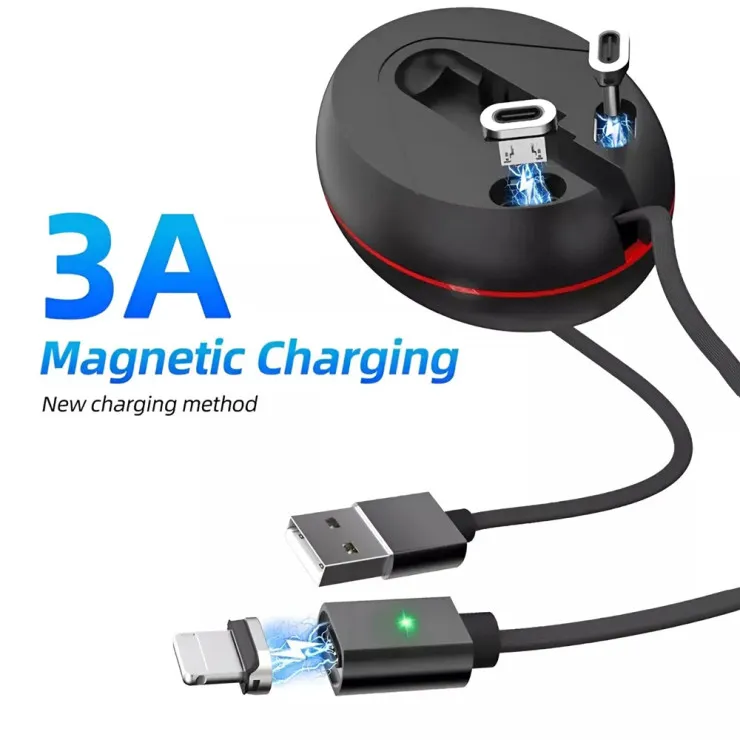 Upgrade to our 3-IN-1 magnetic cable, featuring rapid 3A charging and 480-Mbps data sync capabilities. The retractable feature and magnetic design enhance usability and organization, ideal for charging and syncing multiple devices.