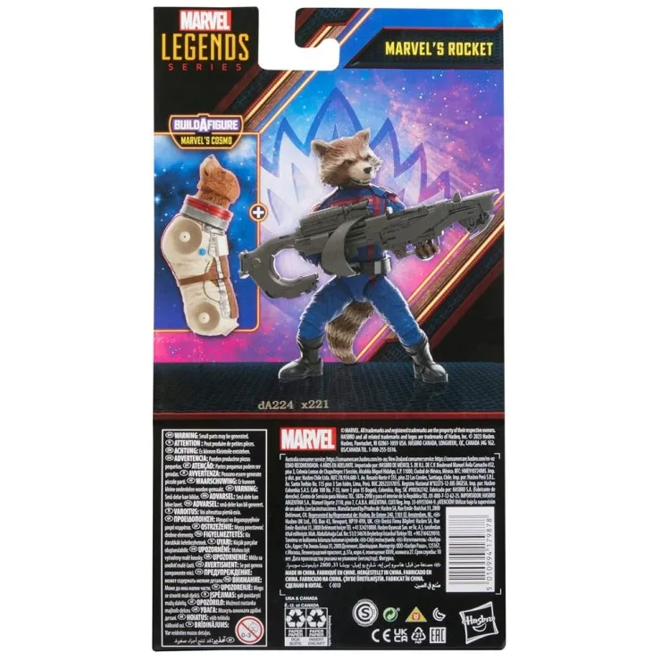 | Brand | Hasbro | Type | Action Figure | Features | Hasbro Marvel Legends 6-inch Rocket figure with premium design, movie-inspired details, blaster accessory, and Build-A-Figure Cosmo part | Material | Plastic | Colour | Multi-color | Item model number | F6608 | Manufacturer recommended age | 4 years and up |