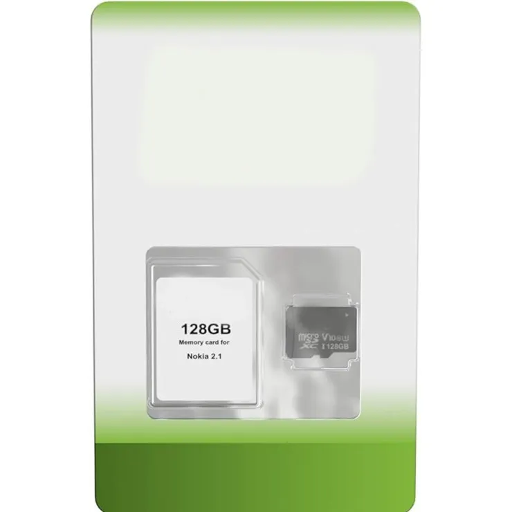 | Compatible Brand | Nokia | Compatible Model | Nokia 2.1 | Flash memory type | Micro SD | Memory storage capacity | 128 GB | Special Feature | Class 10 | Battery cell composition | Zinc | Warrenty | 30 days | Package Include | 1x Memory Card |