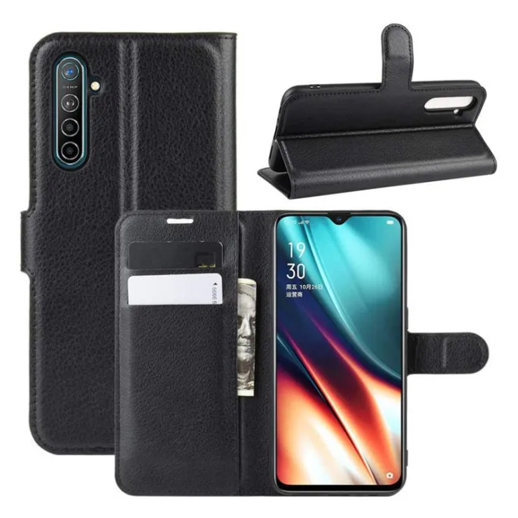 Shock Resistant Wallet Flip Case for Oppo K5 (2019) – Black PU Leather