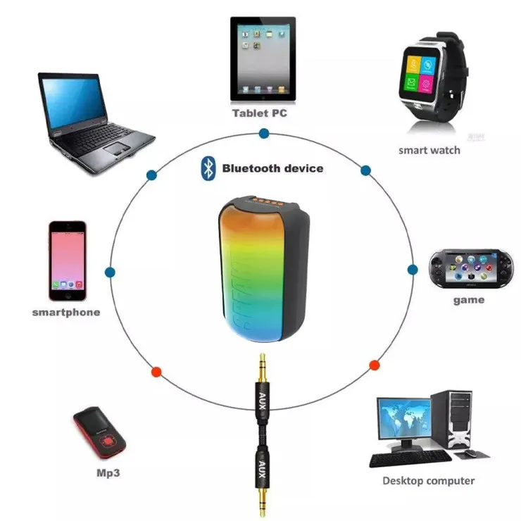 This wireless speaker works flawlessly with all Bluetooth-enabled devices, including iPhones, Samsung phones, Huawei, tablets, laptops, and desktop PCs. It also includes an AUX input and a USB port, offering flexible playback options from non-Bluetooth sources. Plug in, pair up, or stream wirelessly—this speaker adapts to your setup.