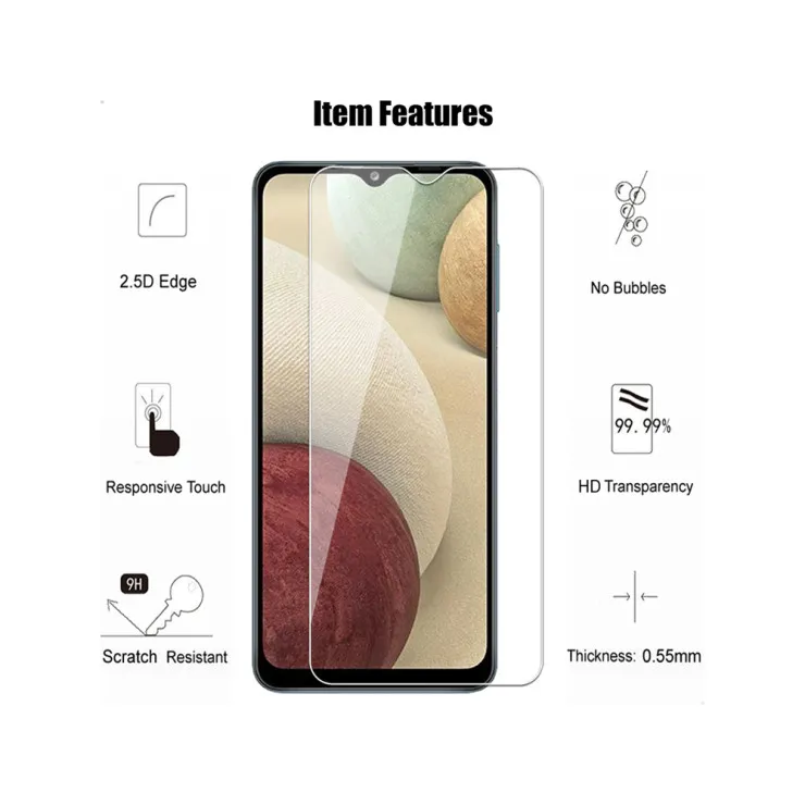 | Compatible Models | Samsung A12 Nacho | Features | Anti-Fingerprint, Anti-Scratch, Lightweight, Shockproof, Antiscratch, Crystal Clear, 9H Hardness | Dimensions | 164 x 75.8 x 8.9 mm (6.46 x 2.98 x 0.35 in) | Item Weight | 65g | Colors | Clear | Package Includes | 2x Tempered Glass |