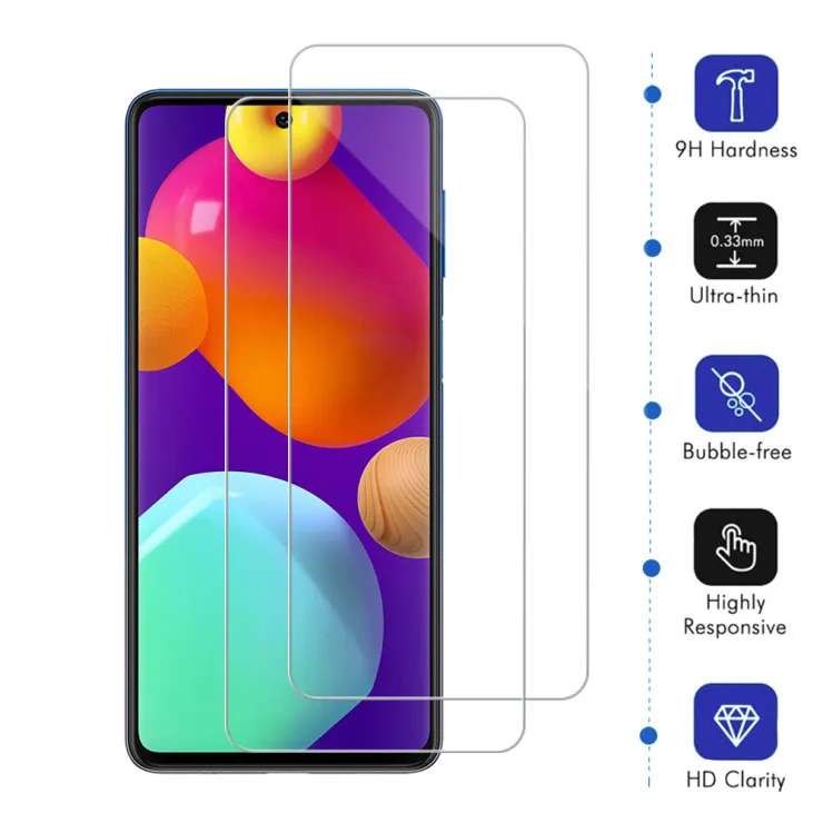 | Compatible Models | Samsung M62 | Features | Anti-Fingerprint, Anti-Scratch, Lightweight, Shockproof, Oleophobic Coating, Crystal Clear, Ultra Thin, Scratch Resistant, 9H Hardness, High Transparency, Dust-Free | Dimensions | 163.9 x 76.3 x 9.5 mm (6.45 x 3.00 x 0.37 in) | Item Weight | 45g | Colors | Clear | Package Includes | 2x Tempered Glass |