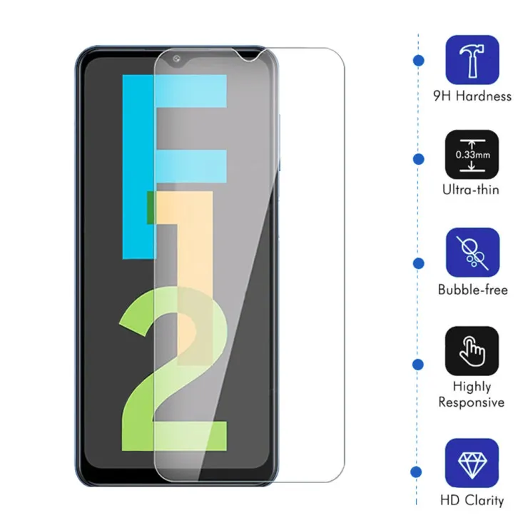 | Compatible Models | Samsung F12 | Features | Anti-Fingerprint, Anti-Scratch, Lightweight, Shockproof, Oleophobic Coating, Crystal Clear, Ultra Thin, Scratch Resistant, 9H Hardness, High Transparency, Dust-Free | Dimensions | 164 x 75.9 x 9.7 mm (6.46 x 2.99 x 0.38 in) | Item Weight | 45g | Colors | Clear | Package Includes | 2x Tempered Glass |