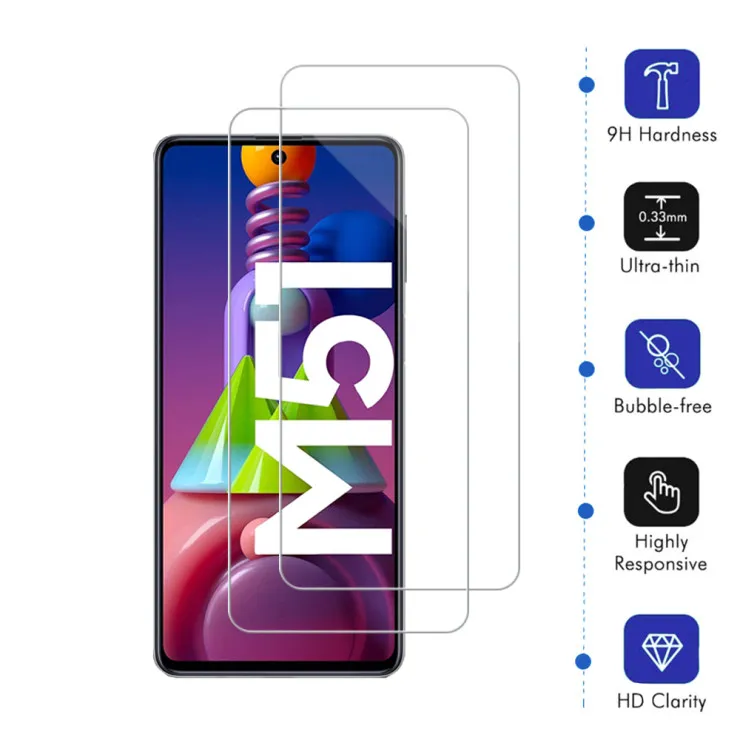 | Compatible Models | Samsung M51 | Features | Anti-Fingerprint, Anti-Scratch, Lightweight, Shockproof, Oleophobic Coating, Crystal Clear, Ultra Thin, Scratch Resistant, 9H Hardness, High Transparency, Dust-Free | Dimensions | 163.9 x 76.3 x 9.5 mm (6.45 x 3.00 x 0.37 in) | Item Weight | 45g | Colors | Clear | Package Includes | 2x Tempered Glass |
