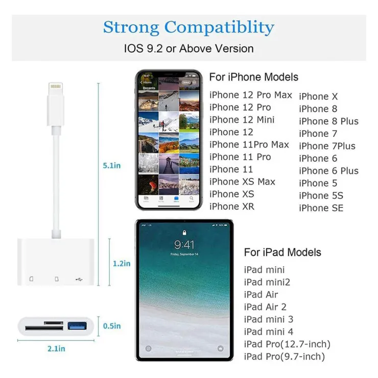 Designed to work seamlessly with any Lightning-compatible iPhone or iPad, this adapter supports popular models like iPhone 6/7/8/SE/11/12/13/14 series, and iPads with Lightning ports including iPad Air, iPad mini, and iPad (5th–8th Gen). It’s a perfect tool for those working within the Apple ecosystem who need a fast and portable memory card reader.