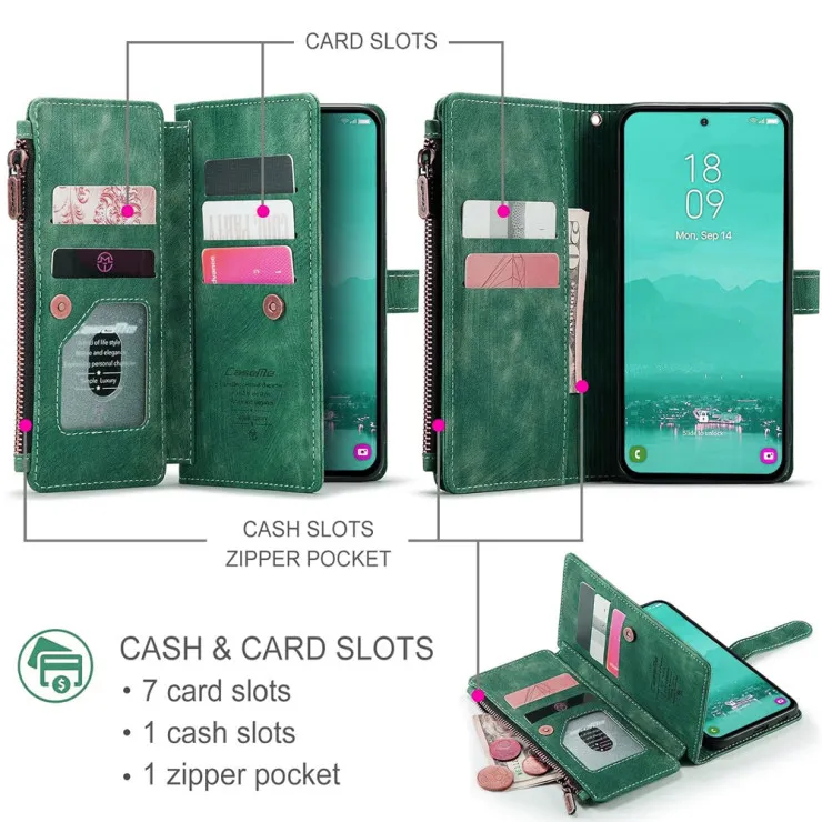 | Compatible Brand | For Samsung | Compatible Model | Samsung Galaxy S24 FE | Typet | Zipper Pocket Leather Wallet Case | Features | leather exterior, flexible Silicon interior, protects against drops and scratches, 7 card slots and 1 cash slot, built-in viewing stand, strong magnetic clasp, easy access to all ports and buttons. | Material | Leather | Color | Black, Green, Red and Brown | Manufacturer Warranty | 60 Days | Package Include | 1x Samsung Galaxy S24 FE Zipper Pocket Leather Wallet Case |