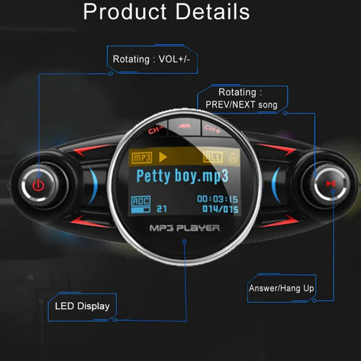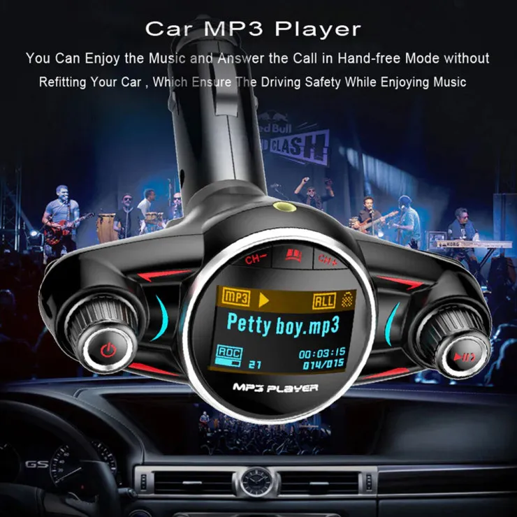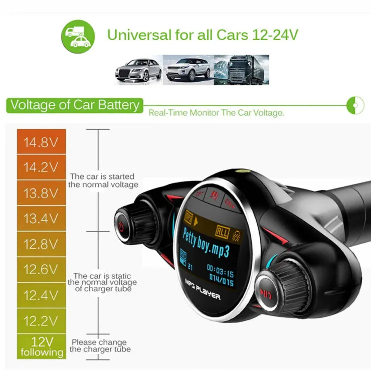 | Compatible Models | Universal | Compatible Brand | Universal | Features | Dual USB, FM Transmitter, Wireless Bluetooth, MP3 Player, AUX Audio, HD Sound Clear, Easy To Use, Fast Charger | Type | Car Charger FM Transmitter | Package Includes | 1X Car Charger FM Transmitter | Material | Plastic | Color | Black | Voltage | 5 V |