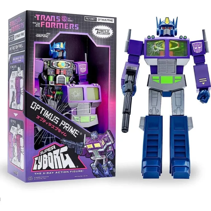 | Brand | Super7 | Type | Action Figure | Features | 11-inch Super7 Transformers Shattered Glass Optimus Prime features purple deco, shattered windshield, removable chestplate with inner details, and Ion Blaster accessory. | Material | Plastic | Manufacturer recommended age | 14 years and up | Package Include | 1X Action Figure |
