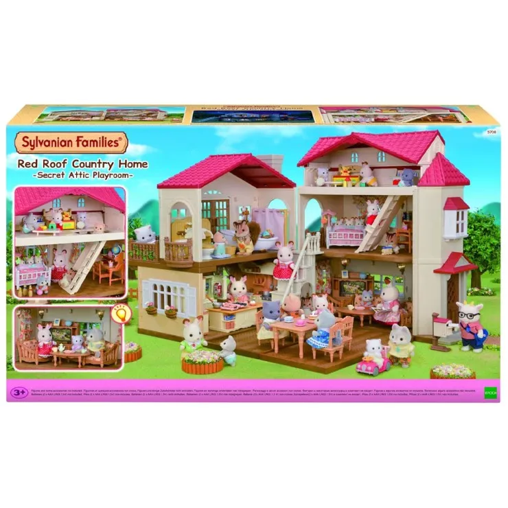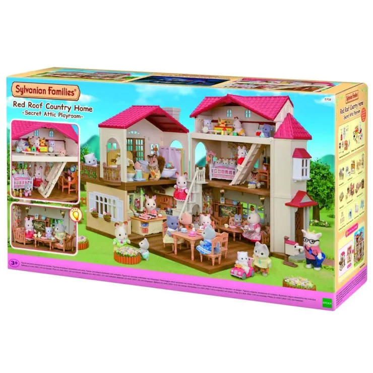 | Brand | Sylvanian Families | Type | Doll Playset | Features | Sylvanian Families 5708 Red Roof Country Home with secret attic, light-up lamp, removable rooms, spring-out ladder, perfect for kids 3+. | Material | Plastic | Item model number | 5708 | Colour | Multicolor | Manufacturer recommended age | 3 years and up |