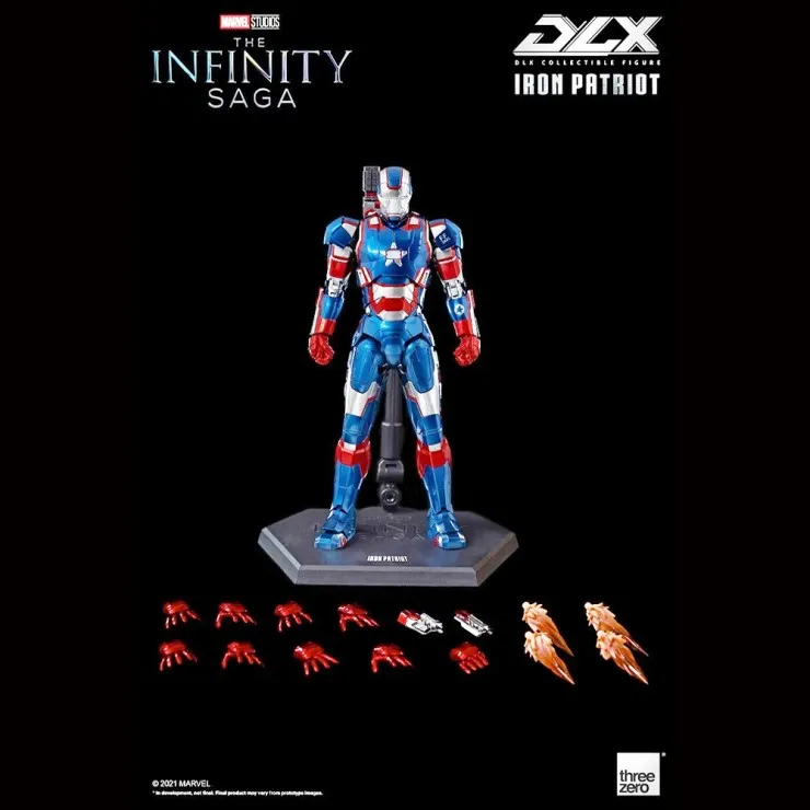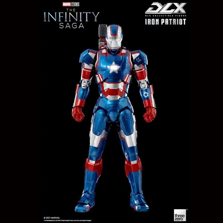 | Brand | Threezero | Type | Action Figure | Features | 6.9" die-cast figure with 48+ articulation points, LED chest & eyes, rotating cannon, attachable micro-cannons, effect parts, interchangeable hands, and DLX stand. | Series | Marvel Infinity Saga DLX | Character | Iron Patriot (James Rhodes) | Model Number | 3Z02570W0 | Scale | 1/12 | Height | Approx. 6.9" / 17.5cm | Material | ABS, PVC, die-cast metal (zinc alloy) | Articulation | 48+ points | Battery Requirement: | 4 x AG1 (not included) | Recommended Age | 15 Years + | Package Include | 1X ThreeZero Iron Patriot DLX 1/12 Action Figure |