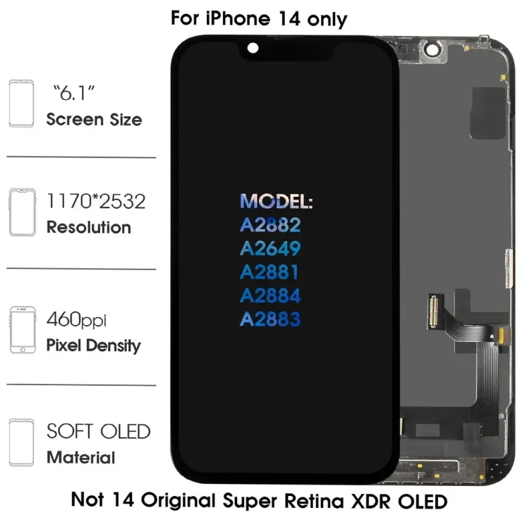 | Compatible Brand | For Apple | Compatible Models | For iPhone 14 | Features | High-quality Soft OLED display, fast & accurate touch response, factory tested & 100% working, scratch & crack resistant, easy to install & perfect fit, affordable replacement option, UK stock & free shipping. | Type | Screen Replacement | Resolution | 1170x2532 pixels | TP Structure | OnCell | Brightness Range | 720 ± 50 (cd/m²) | SRGB | 98.6% | Color Temperature | 7000 ± 500K | Encapsulation Mode | COF | Frame Included | No (Display Only) | Screen Type | Soft OLED LCD | Manufacturer Warranty | 30 Day's | Package Includes | 1 x Screen Replacement |