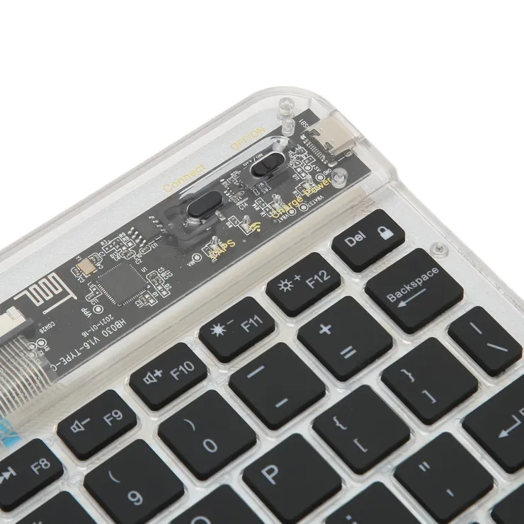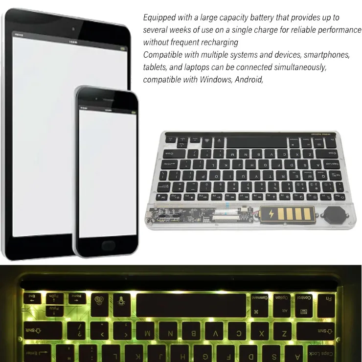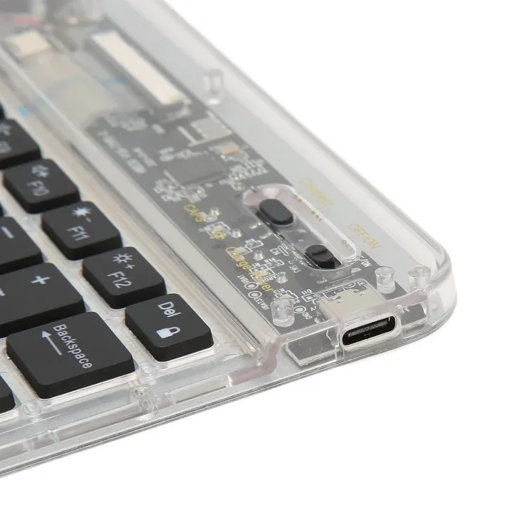 Expand your productivity horizons with a keyboard that seamlessly adapts to your digital lifestyle. Connect up to three devices simultaneously and effortlessly switch between them with dedicated hotkeys. Whether you're working on your desktop, creating content on your tablet, or messaging on your smartphone, this Transparent Wireless Keyboard keeps you connected and in control.