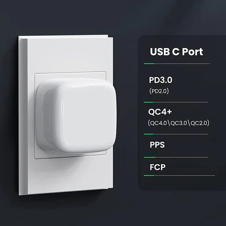 | Compatible devices | Tablets, iPhones, iPads, Cellular Phones | Connectivity technology | USB-C | Special feature | Short Circuit Protection, Fast Charging, 20W Charging | Connector type | USB-C | Input voltage | 100-240V ~ 50-60Hz, 0.6A | Output Power | 5V/3A, 9V/2A, 9V/2.2A | Color | White | Item weight | 90 Grams |