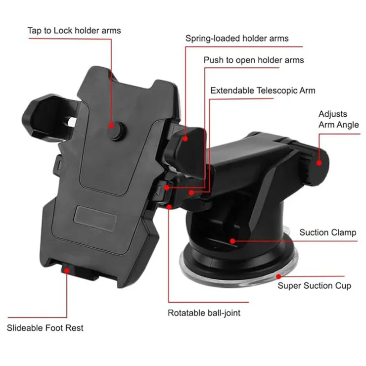 | Compatible Brand | Universal, For Apple, For Samsung | Compatible Model | Universal | Mounting Type | Suction Cup + Clip | Design/Finish | Plain | Colour | Black | Material | Plastic | Features | Car | Type | Car Mount | Manufacturer Warranty | 1 year | Character Family | Cars |