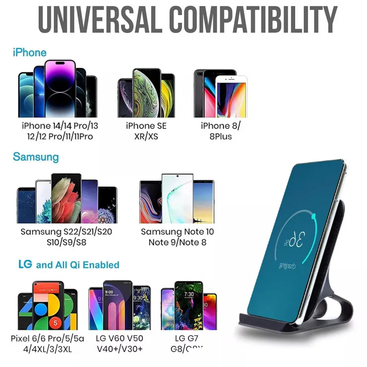 Designed for versatility, this fast charging dock is compatible with a wide range of Qi-enabled smartphones and accessories. It works seamlessly with iPhone 12, 13, 14, 15 series and Samsung Galaxy S20, S21, S22, S23, Z Fold, Z Flip, Note series, and other wireless charging-enabled devices. It also supports wireless earbuds and cases that use the Qi protocol, making it a multipurpose addition to your charging setup.